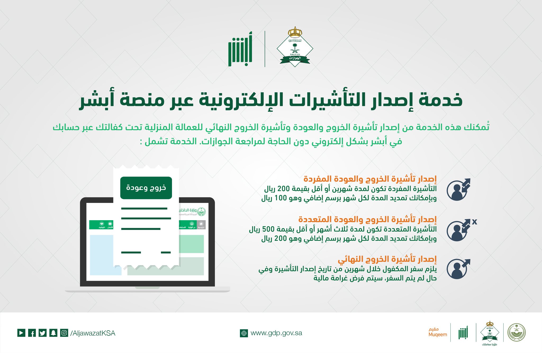 الجوازات السعودية در توییتر وفر وقتك وأصدر تأشيرات الخروج والعودة إلكتروني ا خلال دقائق عبر منصة أبشر