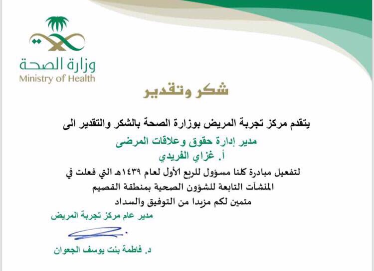 ملتقى المواسى الرسمي Pa Twitter شكر وتقدير يتقدم مركز تجربة المريض بوزارة الصحة بالشكر والتقدير إلى مدير إدارة حقوق و علاقات المرضى أ غزاي بن حمود ابوعيبه الميسوي لتفعيل مبادرة