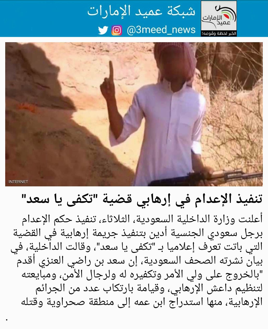 شبكة عميد الإمارات Twitterren أعلنت وزارة الداخلية السعودية الثلاثاء تنفيذ حكم الإعدام برجل سعودي الجنسية أدين بتنفيذ جريمة إرهابية في القضية التي باتت تعرف إعلاميا بـ تكفى يا سعد وقالت الداخلية في